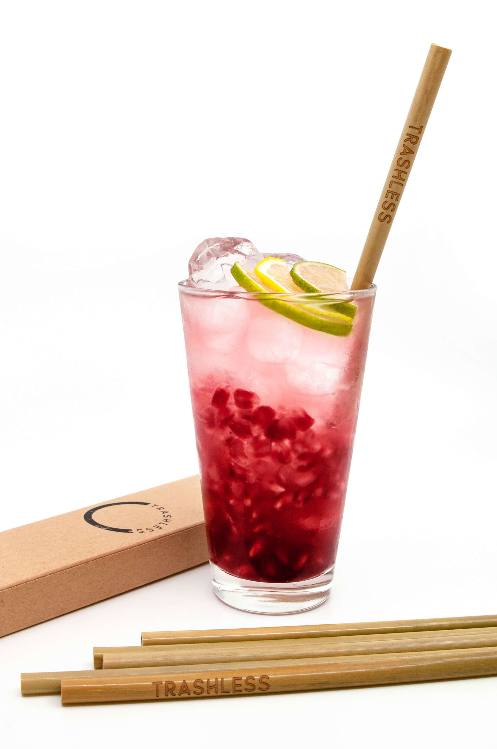 Lieferumfang: 12 Bambusstrohhalme mit graviertem TRASHLESS-Logo inkl. einer Reinigungsbürste, in Karton verpackt (recyclebar).